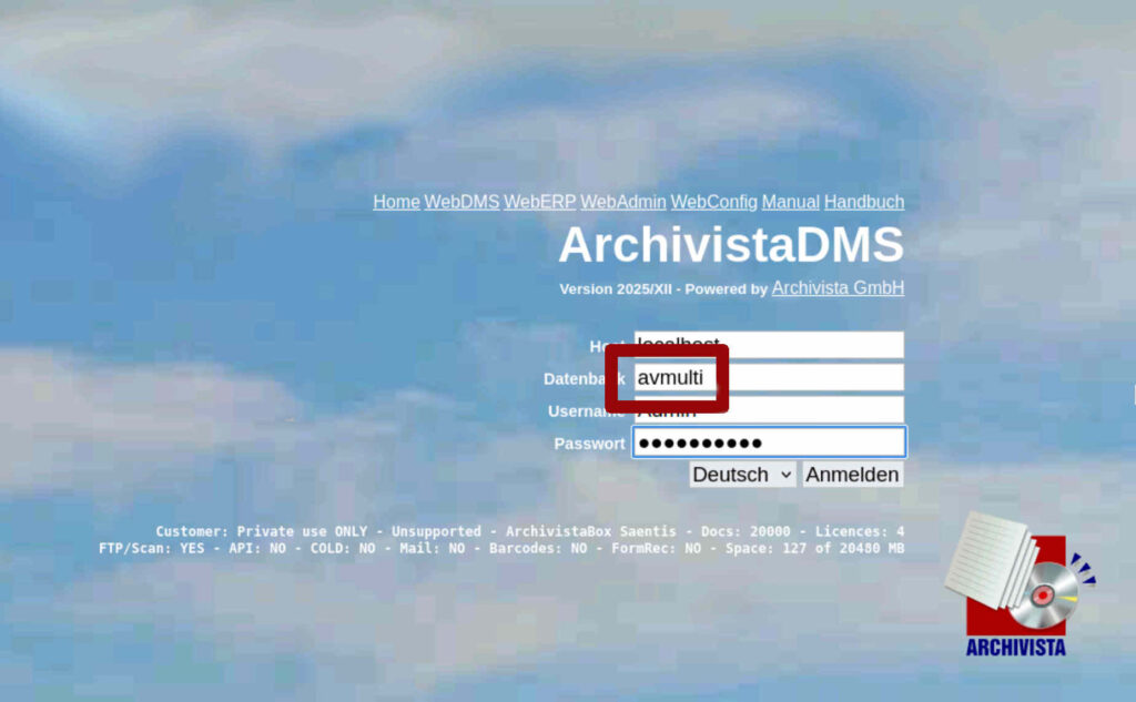 Bei der Anmeldemaske von ArchivistaDMS ist bei Datenbank ‹avmulti› und Admin ‹archivista› als Passwort einzugeben.