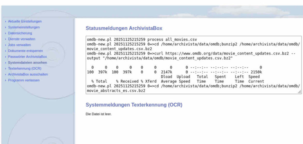 Hinweis: Das Filmverzeichnis OMDB bietet gegenüber anderen Lösungen den Vorteil, dass sämtliche Informationen direkt auf der ArchivistaBox vorhanden sind. Das OMDB-Verzeichnis wird ständig um neue Titel ergänzt. Aus diesem Grunde sollte das Verzeichnis von Zeit zu Zeit in WebConfig aktualisiert werden.