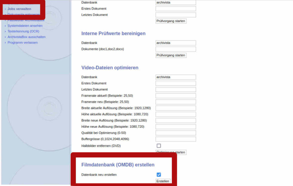 Das Filmverzeichnis kann über Jobs verwalten und dort mit Filmdatenbank (OMDB) erstellen eingerichtet werden.