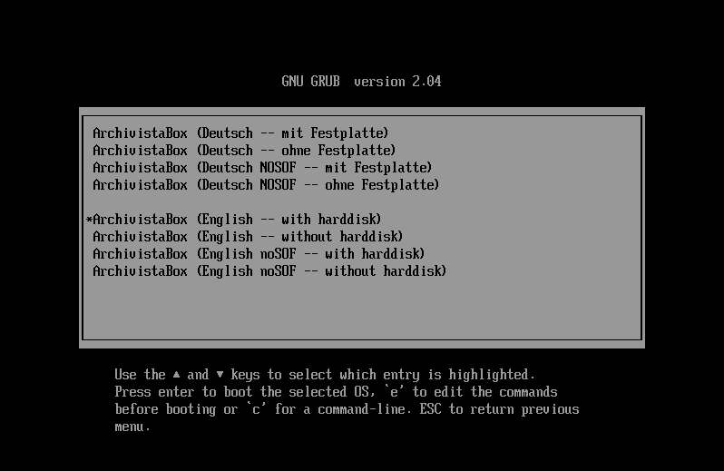 Wird später eine andere (neuere) Version der ArchivistaBox gewünscht, so kann einfach die ISO-Datei bzw. der USB-Stick getauscht werden. Wer direkt ab Festplatte booten möchte, stelle der ArchivistaBox eine leere Festplatte zur Verfügung. In diesem Fall wird beim Hochfahren die leere Festplatte neu formatiert und eine Kopie der ISO-Datei in die ersten beiden Partitionen gelegt. Ab dann bootet die ArchivistaBox direkt ab einer internen Festplatte.
