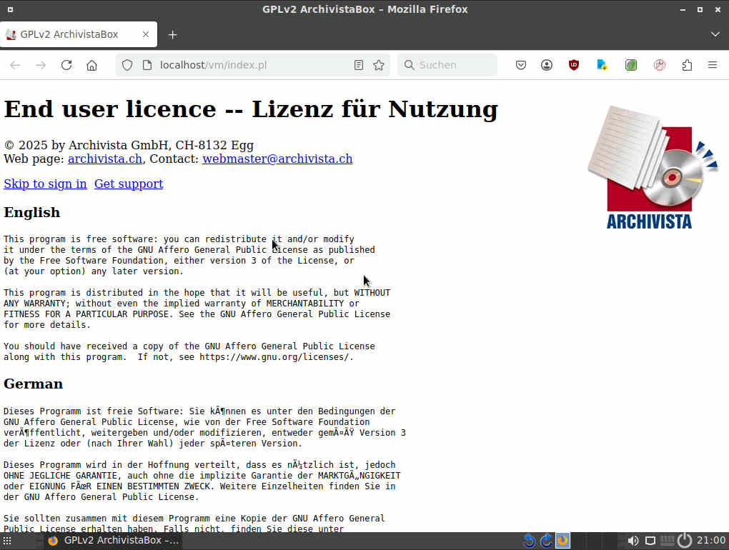Derzeit stehen Deutsch und Englisch zur Verfügung. Dies betrifft aber nur die ArchivistaBox an sich, ArchivistaDMS ist derzeit in den Sprachen Deutsch, Englisch, Französisch und Italienisch verfügbar. Während dem Hochfahren gibt es einen Statusbalken, welcher zeigt, dass das System sich einrichtet.