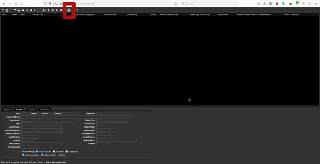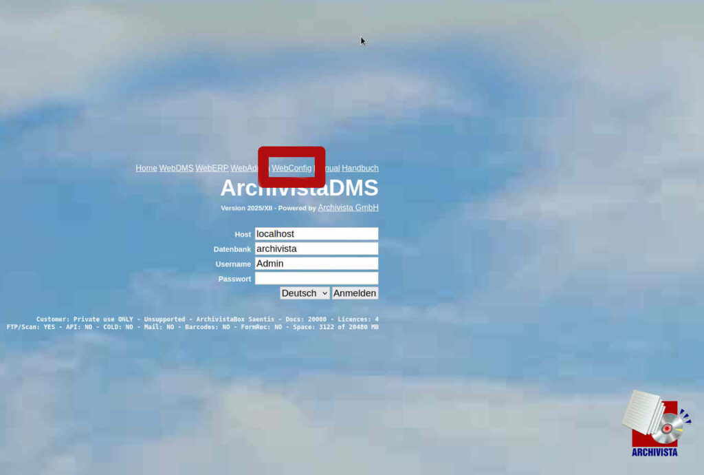 Sobald nach zweimaligem Klicken keine neuen Zeilen mehr erscheinen, ist OMDB eingerichtet. Wir können nun WebConfig verlassen und  oben im Formular auf ArchivistaDMS klicken.