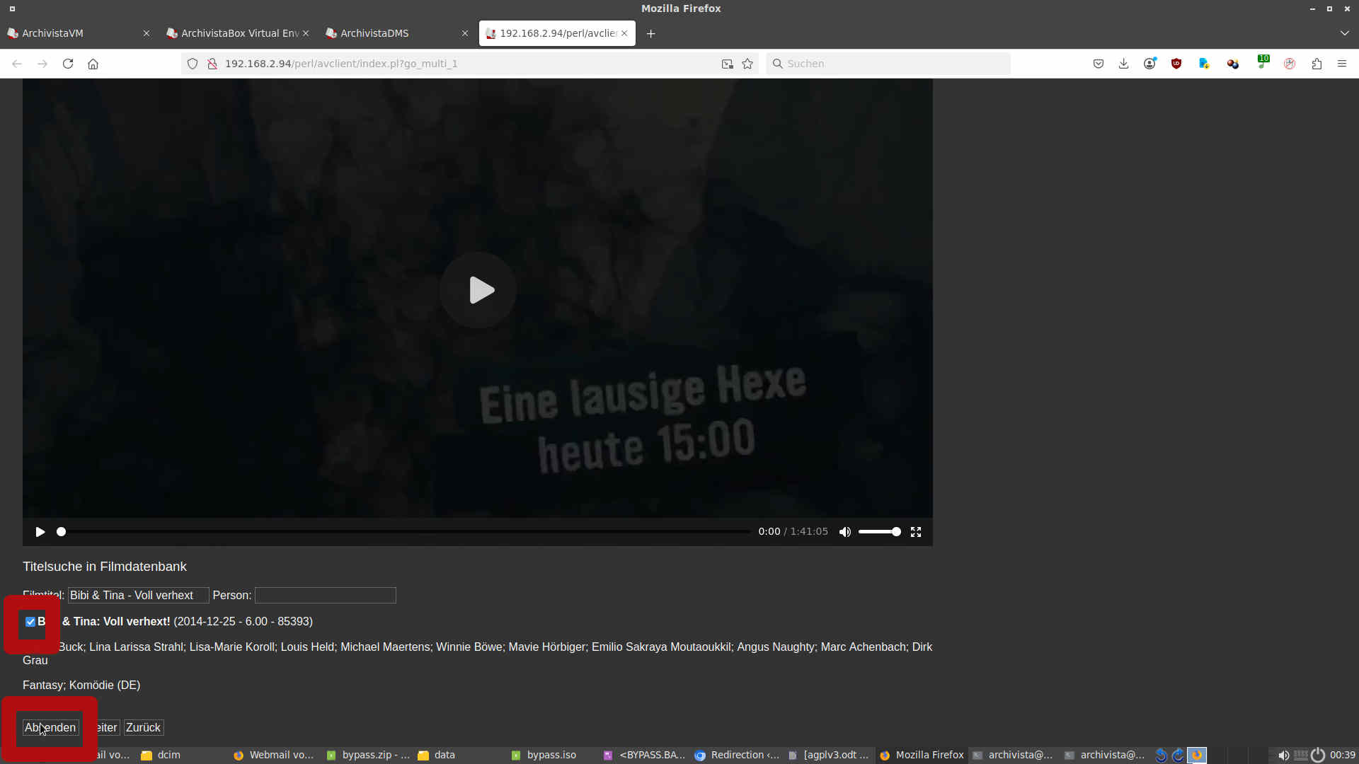 Unterhalb des Filmes werden Beiträge dargestellt, die zum Titel des hochgeladenen Filmes passen könnten. Um die Beschlagwortung zu übernehmen ist zunächst die Checkbox beim gewünschten Titel anzuklicken. Danach ist die Beschlagwortung mit einem Klick auf Absenden zu bestätigen. In der Hauptansicht von ArchivistaDMS ist der Film nun beschlagwortet.
